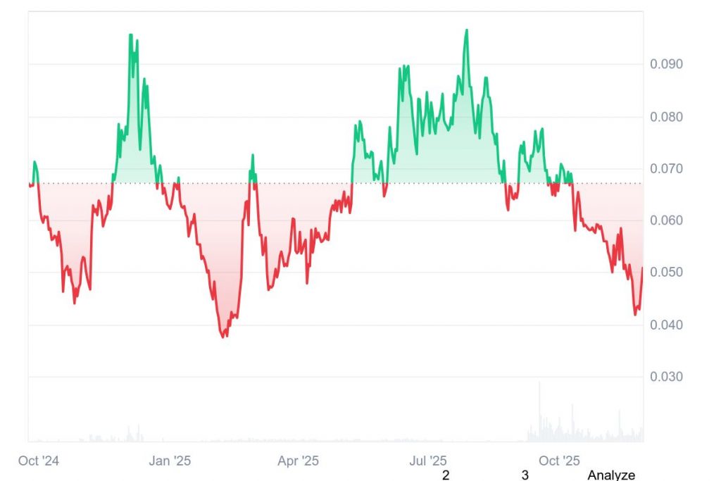 Dadurch gelang es den Bullen erneut, die 0,05-$-Marke zurückzuerobern. Erst in den letzten Tagen hatte es ja einen Crash unter dieses wichtige Unterstützungsniveau auf zwischenzeitlich nur noch 0,04 $ gegeben. Damit war SKY auf einen Long-Term-Support zurückgefallen, der seit dem Launch des Coins im September 2024 schon zweimal als unterste Unterstützungszone fungiert hatte. Seit seinem Launch hat der Coin sich permanent in einem Auf und Ab zwischen dem 0,05-$-Support und dem 0,1-$-Widerstand befunden.