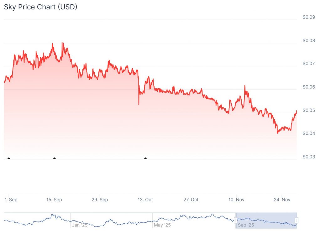 SKY legte innerhalb von 24 Stunden um starke 7,84 % zu und kletterte zurück auf die wichtige 0,05-$-Marke. Viele Anleger fragen sich nun: Ist das der Beginn eines neuen Aufwärtsimpulses, und könnte SKY schon bald erneut die 0,10 $ ins Visier nehmen? Und was sind die Ursachen für den heutigen Kursanstieg des Altcoins?