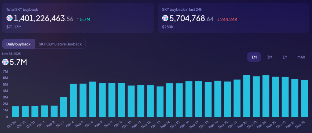 Abgesehen davon dürfte vor allem die Buyback-Dynamik ein Haupttreiber des Aufschwungs gewesen sein. Laut Daten von SKY Money steigen die Buybacks seit Anfang November nämlich kontinuierlich an. Derzeit beläuft sich die gesamte Menge der zurückgekauften Tokens auf 1,401 Milliarden SKY, mit einem Gegenwert von 71,13 Millionen $. Im Angesicht einer Gesamtmarktkapitalisierung von 1,15 Milliarden $ macht das schon einmal einen erheblichen Teil aus.