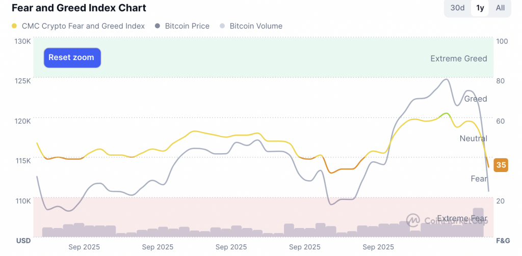 Die größten Verluste unter den Top-100-Coins beliefen sich auf über 40 % innerhalb der letzten 24 Stunden bei den Kryptos ICP und DEXE. Gleichzeitig verschlechterte sich das Marktsentiment drastisch. Der Fear and Greed Index fiel von über 60 auf aktuell nur noch 35 Punkte zurück und liegt damit klar im Bereich der Angst.