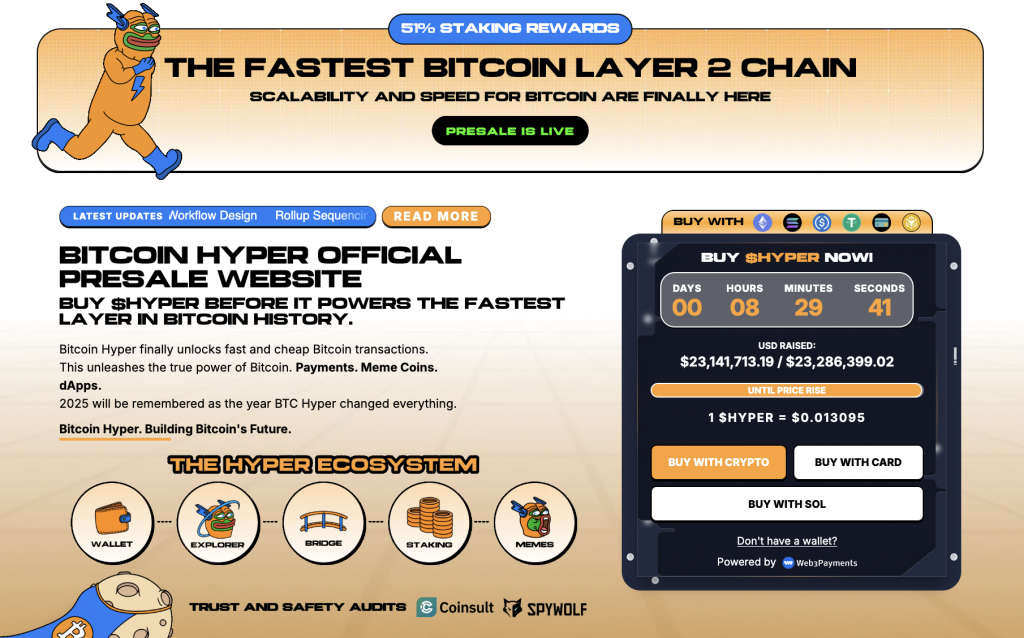 Der Coin kann derzeit nämlich nur über die offizielle Website des dahinterstehenden Projekts Bitcoin Hyper im Presale erworben werden. Hier wird HYPER aktuell zum rabattierten Kurs von 0,013095 $ verkauft. Der Einstieg ist sowohl mit Bankkarte als auch mit etablierten Kryptowährungen möglich.