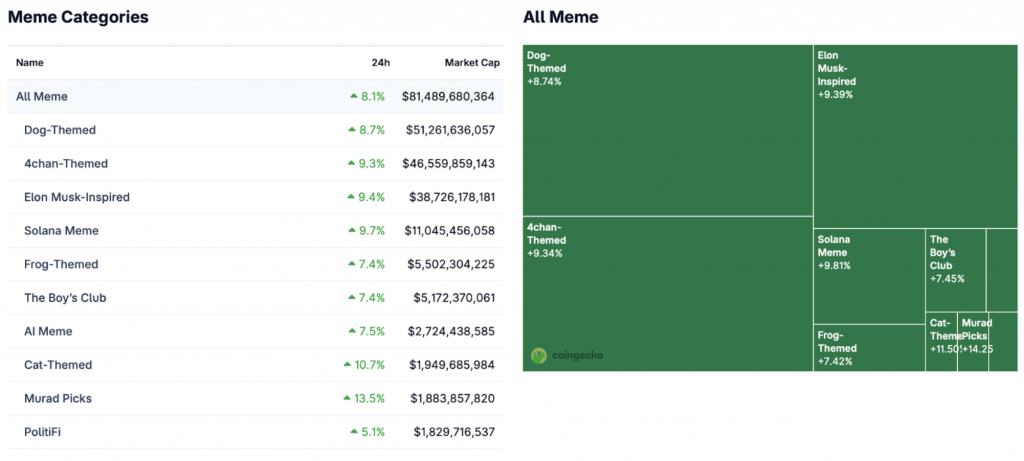 Besonders stark fiel die Entwicklung im Segment der Memecoins aus. Ihr gemeinsamer Marktwert kletterte innerhalb von 24 Stunden auf mehr als 81 Milliarden US-Dollar, was einem Zuwachs von 8 Prozent entspricht. Parallel dazu stieg das Handelsvolumen auf rund 9 Milliarden US-Dollar. Einzelne Coins verzeichneten dabei überdurchschnittliche Bewegungen: Dogecoin (DOGE) stieg um 9,5 Prozent, Shiba Inu (SHIB) um 6 Prozent und Pepe (PEPE) um 7 Prozent. Zu den auffälligsten Gewinnern gehörte SPX6900 (SPX), das sich nach einem Rückgang am Vortag um fast 20 Prozent erholte.