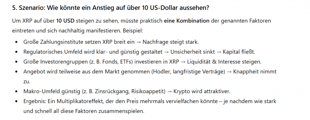 (ChatGPT begründet sein Kursziel von 10 US-Dollar für $XRP mit verschiedenen Faktoren und Kurstreibern – Quelle: chatgpt.com)