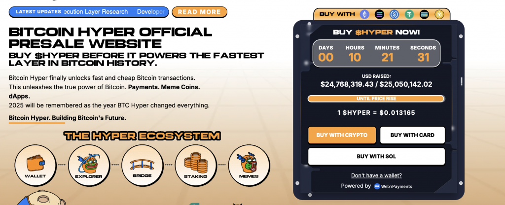Der zugehörige $HYPER-Token befindet sich aktuell noch im Presale, was frühen Anlegern eine außergewöhnliche Einstiegschance bietet. Das starke Interesse spricht für sich. Fast 25 Millionen Dollar wurden bereits investiert, lange bevor der Token überhaupt an den Börsen gehandelt wird. Immer mehr Marktbeobachter halten es daher für möglich, dass Bitcoin Hyper sich nach dem Launch schnell zu einem Top 100 Projekt entwickeln und zu einem der großen Gewinner des kommenden Bullruns werden könnte.