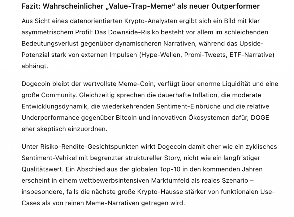 Im Szenario-Vergleich dominiert ein vorsichtiges Basisszenario: moderate Kursbewegungen, aber sinkende relative Bedeutung. Bullische Varianten gelten als möglich, jedoch abhängig von externen Impulsen wie viralen Events oder Promis wie Elon Musk. Deutlich wahrscheinlicher sei jedoch laut ChatGPT ein gradueller Bedeutungsverlust im Zuge wachsender Konkurrenz.
