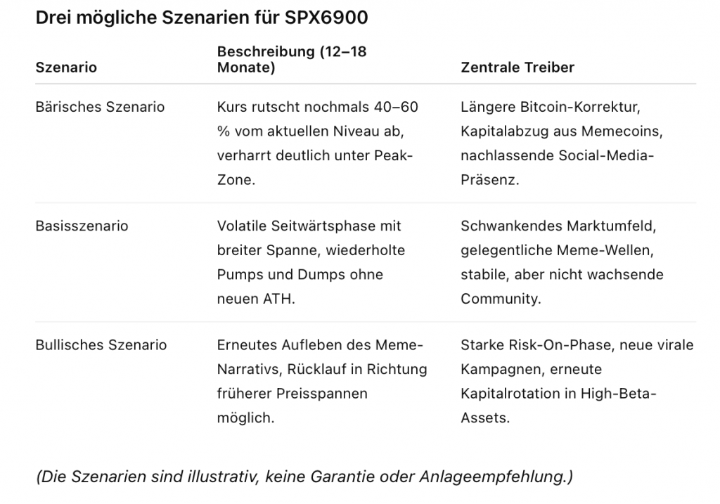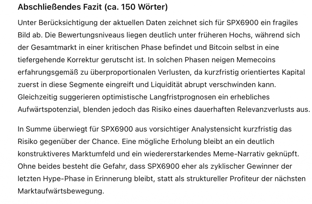 Das Fazit von ChatGPT lautet also wie folgt: Kurzfristig überwiegen die Abwärtsrisiken deutlich. Langfristige Erholungschancen bestehen zwar, sie hängen jedoch davon ab, ob SPX6900 das Narrativ erneut für sich gewinnen kann und die Liquidität nicht versiegt. Ohne frischen Hype bleibt der Token laut ChatGPT eher ein Kandidat für eine länger anhaltende Seitwärts- oder Schwächephase.