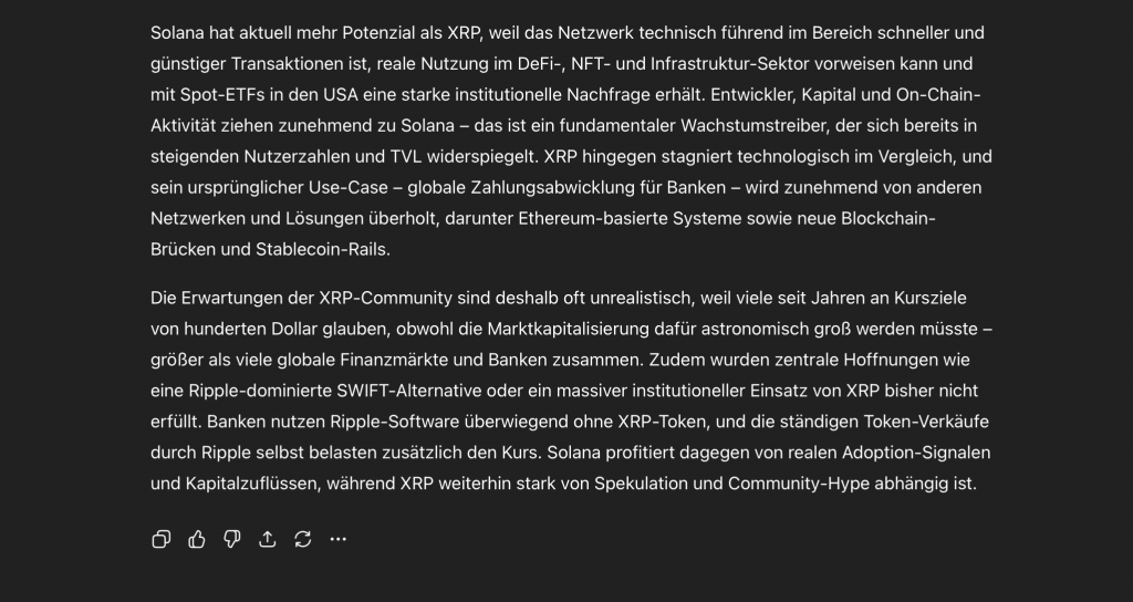 (ChatGPT über Solana und XRP – Quelle: ChatGPT)