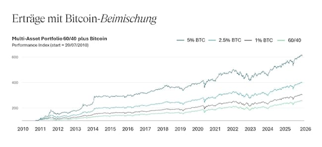 Im Rahmen einer Simulation wurden mehr als 1.000 Portfolios mit Laufzeiten zwischen fünf und vierzehn Jahren untersucht. Die Ergebnisse deuten darauf hin, dass Portfolios mit einem Bitcoin-Anteil zwischen 1 Prozent und 5 Prozent in den getesteten Szenarien höhere risikoadjustierte Renditen gemessen an der Sharpe Ratio aufwiesen als Portfolios ohne Krypto-Beimischung. Die Sharpe Ratio beschreibt das Verhältnis zwischen Rendite und Risiko und dient als Indikator zur Beurteilung der risikoadjustierten Performance.