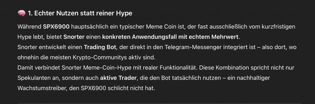 $SPX hat einen Hype generiert, der frühe Investoren reich gemacht hat. Allerdings kann dieser Hype eben auch genauso schnell wieder verfliegen, da Meme Coins in der Regel keinen realen Nutzen haben. Anders ist das bei Snorter und das ist auch der Grund, warum ChatGPT der Meinung ist, dass Snorter jetzt deutlich mehr Potenzial hat.
