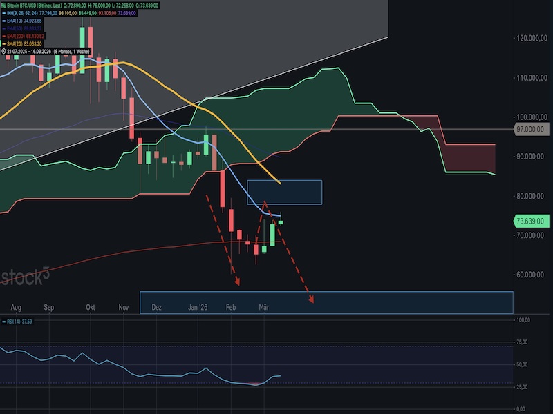 Die Kryptowährung Bitcoin (BTC/USD) hat seit seinem Allzeithoch über 125.000 US-Dollar eine massive Korrektur durchlaufen und notiert am heutigen Dienstag bei rund 73.639 Dollar. Seit Dezember 2025 hat die Kryptowährung damit fast 40 Prozent an Wert verloren. Der Abwärtstrend ist weiterhin intakt und der Hochlauf ist aktuell lediglich als Erholung im übergeordneten Rücklauf zu sehen.