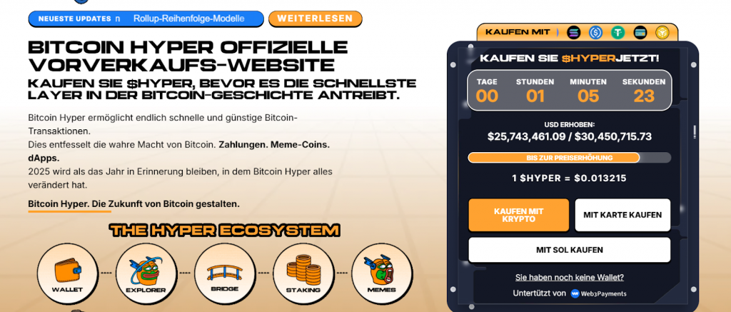 Sollte Bitcoin Hyper das führende DeFi-Ökosystem für Bitcoin werden, könnte das Projekt zu einer der wichtigsten Entwicklungen des aktuellen Zyklus zählen. Das zeigt sich auch bereits in der hohen Nachfrage. Aktuell ist der $HYPER-Token noch im Vorverkauf erhältlich und schon jetzt haben Anleger fast 26 Millionen Dollar investiert. Daher stehen die Chancen gut, dass es sich hier um den nächsten Milliarden Dollar Altcoin handeln könnte, was für frühe Investoren extrem hohe Renditen bedeuten würde.