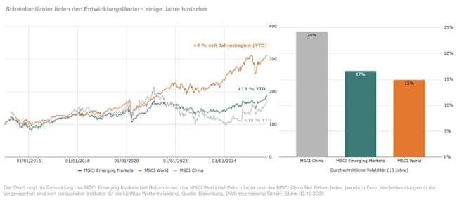 Viele Anleger konzentrieren ihre Portfolios stark auf entwickelte Märkte, insbesondere die USA und Europa. Das ist nachvollziehbar, schließlich hinkten Schwellenländer-Aktien über viele Jahre sowohl den US-amerikanischen als auch den europäischen Märkten hinterher. Doch in 2025 zeigt sich ein gänzlich anderes Bild. Schwellenländer und insbesondere der chinesische Aktienmarkt entwickeln sich besser als die Industrieländer.