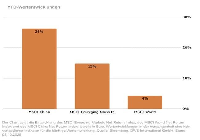 In Euro weist der MSCI China Index1 seit Jahresbeginn ein Plus von 26 Prozent (Stand: 03.10.2025) auf. Während auch Schwellenländer-Aktien2 ein zweistelliges Plus verzeichnen können, brachte der MSCI World Index3 lediglich +4 Prozent aufs Parkett.4 Was steckt hinter der neuerlichen Outperformance und welche Faktoren könnten die positive Entwicklung in China weiter stützen?