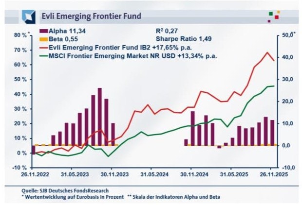 Per 26. November 2025 hat der Evli Emerging Frontier Fund über drei Jahre eine kumulierte Wertentwicklung von +62,87 Prozent in Euro erwirtschaftet, was einer attraktiven Rendite von +17,65 Prozent p.a. entspricht. Die Gegenüberstellung zum MSCI Frontier Emerging Market als Referenzindex beweist, wie hoch diese Performanceleistung einzuschätzen ist: Die Benchmark verzeichnet im selben Zeitraum lediglich eine Performance von +45,60 Prozent auf Eurobasis bzw. ein Ergebnis von +13,34 Prozent jährlich. Beim Wechsel auf die Jahresbetrachtung befindet sich der Fonds aus dem hohen Norden gegenüber dem MSCI-Vergleichsindex erneut vorn: Mit einer Jahresrendite von +22,42 Prozent in Euro liegt die Performance des aktiv gemanagten FondsProduktes knapp oberhalb der des passiven Referenzindex für die Frontier- und Emerging Markets, der mit einem Plus von +22,05 Prozent aufwartet. Die langfristig erzielte Mehrrendite von über vier Prozentpunkten jährlich in Kombination mit dem auch kurzfristig besseren Abschneiden macht klar, dass der Evli-Fonds deutlicher Sieger im Performancevergleich ist. Wie manifestiert sich dies in den Alpha-Werten des FondsProdukts?