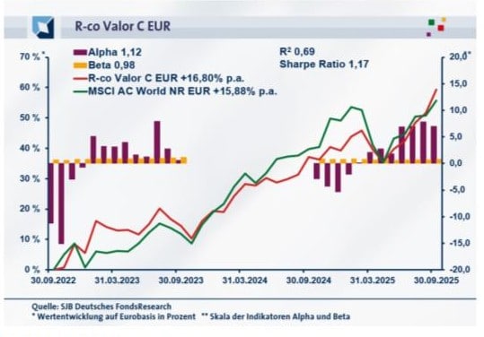 Per 30. September 2025 hat der R-co Valor über drei Jahre eine kumulierte Wertentwicklung von +59,37 Prozent in Euro erzielt, was einer Rendite von +16,80 Prozent p.a. entspricht. Mit diesen rundherum überzeugenden Performancewerten kann der flexible Multi-Asset-Fonds sogar den MSCI AC World als Vergleichsindex schlagen, wie die Gegenüberstellung der Zahlen verdeutlicht: Der weltweit anlegende Aktienindex wartet lediglich mit einer Gesamtrendite von +55,62 Prozent bzw. einem Ergebnis von +15,88 Prozent jährlich auf Eurobasis auf. Beim Wechsel des Vergleichszeitraums auf ein Jahr baut der Rothschild-Fonds seinen Spitzenplatz sogar aus und erhöht den jährlichen Renditevorsprung auf fünf Prozentpunkte: Die Performance von +16,18 Prozent in Euro fällt erheblich besser aus als das Ergebnis von +11,36 Prozent, das der MSCI AC World NR EUR generiert. Als dynamischer Mischfonds eine Outperformance zum globalen Aktienmarkt erreicht - dieses Kunststück ist Marktstratege Ignatiew tatsächlich in beiden untersuchten Zeithorizonten gelungen, was ihn zum klaren Sieger im Rendite-Wettbewerb macht. Was tragen die Alpha-Werte zur FondsAnalyse bei?