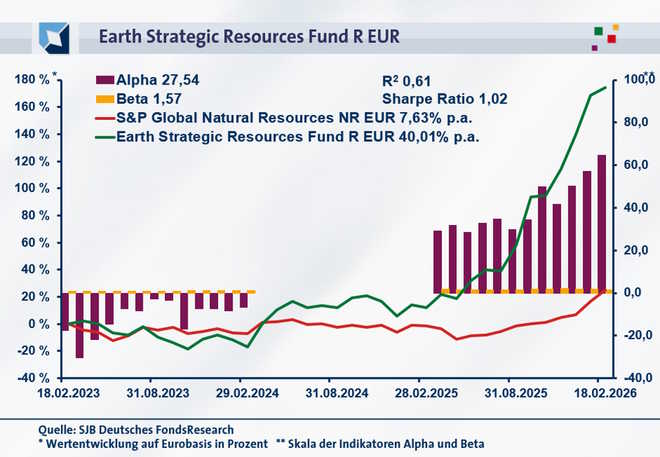 Per 18. Februar 2026 hat der Earth Strategic Resources Fund eine kumulierte Wertentwicklung von +174,52 Prozent in Euro über drei Jahre zu verzeichnen. Eine höchst attraktive Performance, die einer Rendite von +40,01 Prozent p.a. entspricht. Wie sehr diese herausragende Performanceleistung auf qualitativ hochwertiges FondsManagement zurückzuführen ist, zeigt die Gegenüberstellung zum weltweiten Rohstoffsektor: Der S&P Global Natural Resources Index als SJB-Benchmark hat im selben Zeitraum nur eine Gesamtperformance von +24,69 Prozent bzw. eine Jahresrendite von +7,63 Prozent auf Eurobasis erreicht. Beim Wechsel auf den kurzfristigen Betrachtungshorizont baut der aktiv gemanagte Fonds mit ESG-Fokus seinen Renditevorsprung noch aus: Über ein Jahr verzeichnet er eine Performance von +128,18 Prozent in Euro, während der globale S&P Rohstoffindex mit einem Ergebnis von +23,04 Prozent aufwartet. Die so generierte dreistellige Outperformance von mehr als 105 Prozentpunkten ist ähnlich beeindruckend wie das massive Performanceplus von gut 32 Prozentpunkten jährlich über den Dreijahreszeitraum. Dies macht den aktiv gemanagten Rohstoff-Fonds mit großem Vorsprung zur Nummer eins im Renditevergleich. Wie wirkt sich dies auf die Alpha-Werte aus?