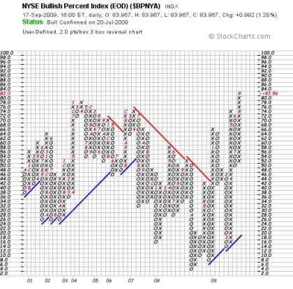 Abgebildet ist hier der breite Markt der New York Stock Exchange mit ihren über 3.000 Werten als Bullish Percent Index. An der rechten X-Spalte erkennen Sie den positiven, aber überhitzten Marktzustand der NYSE. Fast 84 % der hier gehandelten Werte markieren ein objektives Point & Figure Kaufsignal, was einer sehr ungewöhnlichen Marktbreite entspricht.