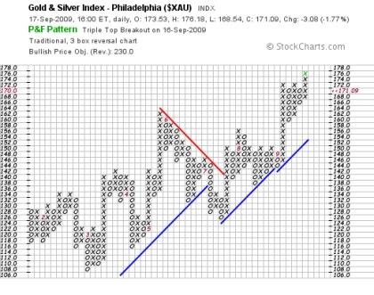 Gemäß der P & F Philosophie ist es sehr wichtig, den Sektor zu analysieren in dem sich ein Einzelwert bewegt, bevor man in diesen investiert. Denn ca. 75 % des Risikos liegen im Gesamtmarkt und im Sektor. Der momentan viel beachtete Index der Minenwerte des S & P 500 befindet sich z.B. derzeit auf einem Stand des Sektor Bullish Percent von 72, was für den Goldsektor noch kein besonders überhitzter Zustand ist. Unter diesem Gesichtspunkt ist es also noch nicht zu spät für ein Engagement in diesen Sektor oder in ausgesuchte Minenwerte.