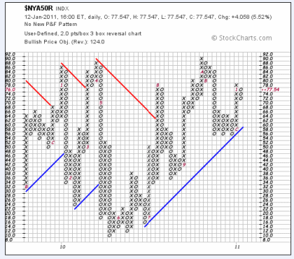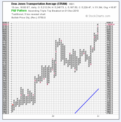 Bislang sehen die Anleger jedoch nur die positive Seite der Medaille, wie der Point & Figure Chart des für die Konjunktur wichtigen Transportsektors zeigt. Dieser deutet darauf, dass die Bullen nach wie vor eindeutig im Vorteil sind. Denn die Transportaktien markieren bereits ein neues Hoch, während der Dow Jones noch mit dem Niveau bei etwa 11.700 Punkten kämpft. Bitte beachten Sie den dynamischen Ausbruch und das deutliche Kaufsignal des vergangenen Dezember (Buchstabe C in der rechten Spalte)