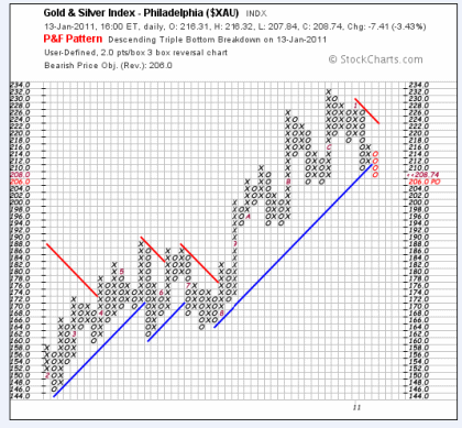 Trotz und wegen der positiven Kommentare schwächeln die Goldminen, was nach der Performance auch nicht verwundern sollte. Der im August begonnene Aufwärtstrend wurde gestern verletzt und ich tippe darauf, dass sich die Korrektur ausweitet. Dafür spricht auch der innere Zustand des Sektors, den ich hier aus urheberrechtlichen Gründen nicht abbilden darf. Dort verringert sich bereits die Anzahl der objektiven Kaufsignale seit etwa drei Wochen bei gleichzeitig steigendem Index. Diese Divergenz ist kein gutes Zeichen und bedeutet, dass frühe Anleger Kapital aus dem Sektor abziehen, während späte Anleger noch angelockt werden. Eine Umverteilungsphase könnte hier also bereits im Gange sein. Doch auch der bekanntere äußere Chart des Philadelphia Goldminen Index macht einen angeschlagenen Eindruck.
