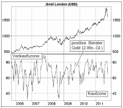 Beim jüngsten Aktienmarktabsturz war es genauso. In den ersten Tagen, als der DAX von 7.000 in Richtung 6.000 fiel, war noch von günstigen Einstiegsmöglichkeiten zu lesen, jetzt reden davon nur noch vereinzelte Experten. Die anderen reden vom unausweichlichen Zusammenbruch des Euros und das damit für die Aktienmärkte alles noch viel schlimmer kommen müsse. Leider zeigt auch der Hulbert Gold Newsletter Sentiment Index (HGNSI), der kurzfristig agierende Goldmarktakteure in den USA erfasst, schon wieder aufflammenden Optimismus für das Edelmetall. Nach drei Tagen im Minus, ist er nun bereits wieder auf + 7 gesprungen. Positiv zu bewerten ist dagegen die Tatsache, dass die jüngste Umfrage von Consensus nur noch 54 Prozent Goldoptimisten gezählt hat. In der vergangenen Woche waren dies noch 74 Prozent und die Wochen davor hatte dieser Index länger über 80 Prozent notiert. Werte um 50 Prozent sollte es jedoch über einen längeren Zeitraum geben, bevor von einer Absicherung nach unten aus stimmungstechnischer Sicht gesprochen werden kann. Denn es hat auch einige Wochen gedauert, bis der übertriebene Optimismus zu einem markanten Rückschlag geführt hat.