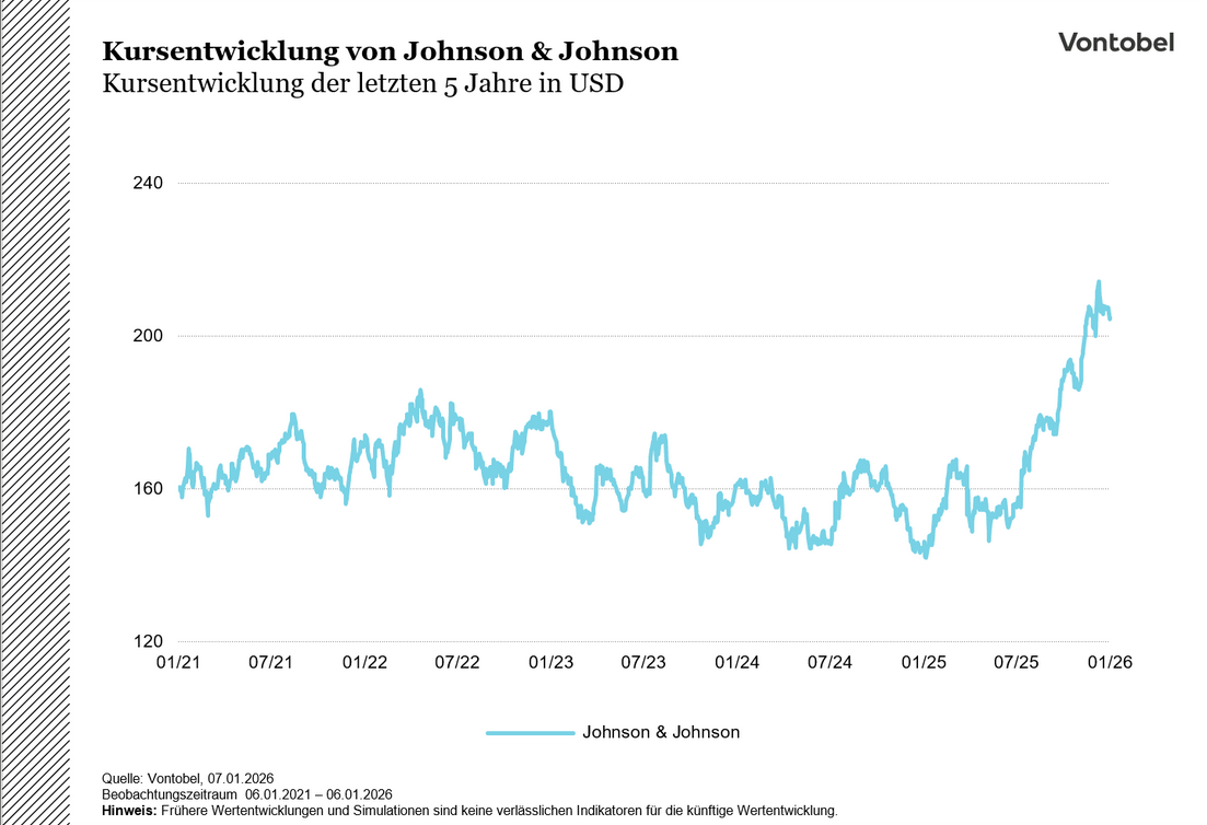 Johnson & Johnson ist ebenfalls ein weltweit tätiger Gesundheitskonzern, der sich auf die Entwicklung und den Vertrieb verschreibungspflichtiger Medikamente sowie Medizintechnik spezialisiert hat. Besonders stark positioniert ist das Unternehmen im Bereich innovativer Arzneimittel und moderner Medizintechnik, unter anderem für die Chirurgie und die Augenheilkunde. Johnson & Johnson ist in über 175 Ländern aktiv und investiert täglich zweistellige Millionenbeträge in Forschung und Entwicklung. Diese konsequenten Investitionen haben zu einem breit gefächerten Portfolio innovativer Produkte geführt, das zahlreiche Therapiegebiete wie Onkologie, Immunologie und Neurowissenschaften abdeckt. Ein weiterer Pluspunkt ist die langjährige Dividendenkontinuität sowie die breite Aufstellung in den Bereichen Pharma, Medizintechnik und Konsumgüter. Die Dividende je Aktie stieg von 3,75 USD im Jahr 2019 auf 4,91 USD im Jahr 2024, wodurch die Aktie besonders für langfristig orientierte Anleger attraktiv wird. Insgesamt zeichnet sich Johnson & Johnson durch ein stabiles Geschäftsmodell aus, wenngleich Risiken durch Rechtsstreitigkeiten und Vergleichsverhandlungen bestehen. Diese werden jedoch regelmäßig juristisch angefochten oder durch außergerichtliche Vergleiche beigelegt.
