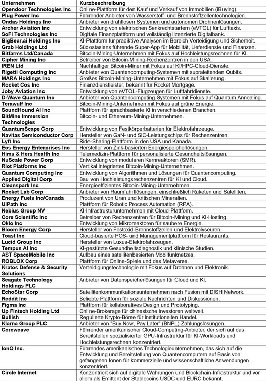 Im Folgenden präsentieren wir Ihnen eine Übersicht über 48 ausgewählte Unternehmen. Diese Unternehmen werden aufgrund ihrer innovativen Geschäftsmodelle und Technologien als potenzielle Akteure bei der Gestaltung zukünftiger Märkte betrachtet. Zu jedem Unternehmen haben wir eine kurze Beschreibung des Geschäftsfeldes sowie die relevanten Faktoren zusammengestellt, die deren potenzielle Attraktivität als Investitionsmöglichkeit beleuchten. Die Übersicht bietet einen Einblick in die Bandbreite der disruptiven Innovationen in verschiedenen Branchen.