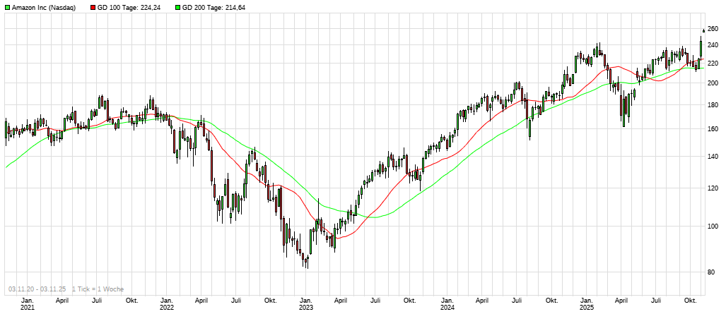 Für das dritte Quartal meldete der Konzern Umsätze von 180,2 Milliarden US-Dollar, ein Zuwachs von 13 Prozent. Das Ergebnis je Aktie lag bei 1,95 US-Dollar. Besonders glänzte die Cloud-Sparte AWS mit 33 Milliarden US-Dollar Umsatz und einem Wachstum von 20,2 Prozent. Operativ verdiente Amazon 17,4 Milliarden US-Dollar, bereinigt um Sondereffekte wären es 21,7 Milliarden gewesen. Unter dem Strich standen 21,2 Milliarden US-Dollar, begünstigt durch einen Vorsteuergewinn aus der Beteiligung an Anthropic.
