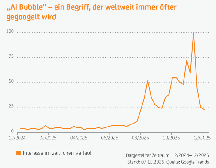 In den vergangenen Monaten ist der Begriff „KI-Blase“ zu einem festen Bestandteil der Finanzberichterstattung geworden. Ob in Wirtschaftsmedien, Kommentaren oder Social Media – kaum ein Tag verging, ohne dass vor einer möglichen „KI-Blase“ oder „AI Bubble“ gewarnt wurde. Ein Beleg hierfür ist die Häufigkeit der Suchanfragen zu diesem Begriff, wie die Google-Trends-Daten zeigen. Das Thema hat eine mediale Präsenz erreicht, die fast schon selbst zum Argument gegen eine unmittelbar bevorstehende Blase wird. Denn echte Spekulationsblasen platzen meist dann, wenn sich kaum jemand ihrer Existenz bewusst ist.