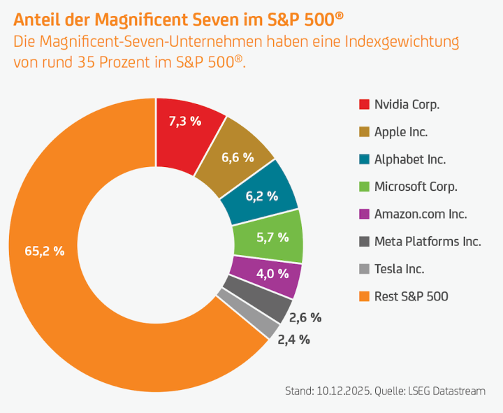 Aktuell entfallen rund 40 Prozent der Portfoliogewichtung auf den IT- und Telekommunikationssektor. Darunter befinden sich namhafte Unternehmen wie Microsoft, Alphabet und Meta, die allesamt zentrale Akteure im Bereich künstliche Intelligenz sind. Dank ihrer profitablen Geschäftsmodelle und hohen Cashflows können sie enorme Summen in Forschung, Entwicklung und den Ausbau von Rechenzentren investieren. Diese Möglichkeiten stehen vielen kleineren Unternehmen und Start-ups nicht im gleichen Umfang zur Verfügung. Ergänzt wird das Portfolio unter anderem durch Nvidia und TSMC, zwei „Schaufelhersteller“. Der Begriff stammt aus dem Goldrausch und beschreibt Unternehmen, die nicht selbst nach „Gold“ suchen, sondern die Ausrüstung bereitstellen – in diesem Fall die Chips und Halbleiter, die die technologische Basis des KI-Booms bilden. Allerdings gilt: Sollte die Dynamik im KI-Sektor nachlassen und der Markt eine Korrektur erleben, könnten gerade diese stark KI-getriebenen Unternehmen besonders empfindlich reagieren.