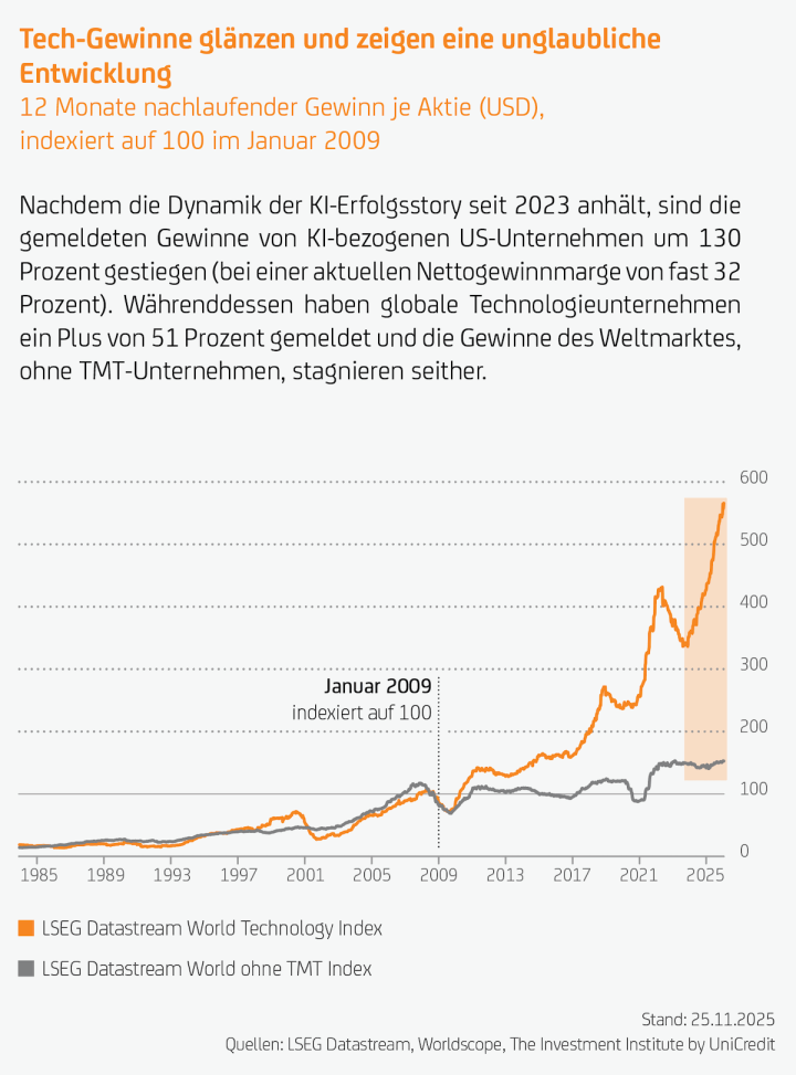 Um zu beurteilen, ob Befürchtungen einer Blase berechtigt sind, muss man sich die aktuelle fundamentale Situation vor Augen führen. Bisher wurden die relevanten Tech-Unternehmen eher von einem starken und nachhaltigen Gewinnwachstum getrieben als von irrationalen Spekulationen über künftiges Wachstum.