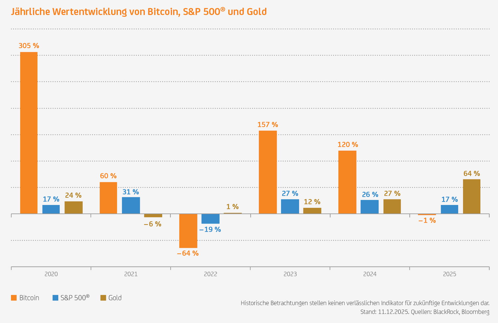 Diese Unabhängigkeit gegenüber klassischen Märkten macht Bitcoin als Depotbeimischung interessant. So zeigte er laut Analysen von BlackRock in den letzten Jahren eine geringe Korrelation zu Aktien, Anleihen oder Gold. Mit Korrelation ist gemeint, wie ähnlich sich zwei Anlagen im Kursverlauf verhalten. Eine geringe Korrelation bedeutet, dass sich zwei Assets oft unterschiedlich entwickeln und nicht gleichzeitig steigen oder fallen. Selbst kleine Allokationen in Bitcoin konnten in der Vergangenheit dazu beitragen, ein Portfolio breiter aufzustellen und die risikobereinigte Rendite langfristig zu verbessern. Entwicklungen der Vergangenheit sind allerdings kein Indikator für zukünftige Ergebnisse.