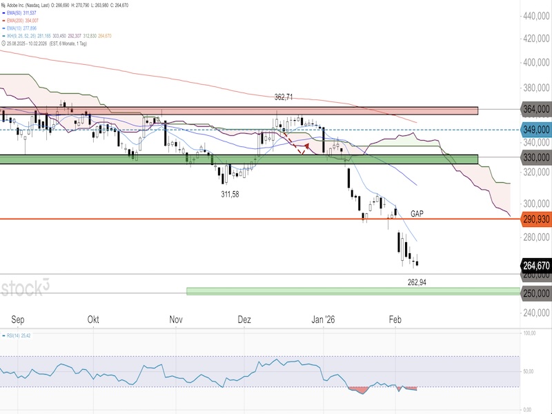 Charttechnisch notiert Adobe im Tageschart weit unter dem 10er-EMA (277,89 Dollar), dem 50er-EMA (311,53 Dollar) und dem 200er-EMA (354,00 Dollar), womit der übergeordnete Abwärtstrend klar intakt ist. Die Aktie notiert zudem tief unter der Ichimoku-Wolke, was die bearishe Lage bestätigt. Der RSI(14) notiert bei 25,42 im stark überverkauften Bereich, was kurzfristig auf eine technische Gegenbewegung hindeuten könnte. Eine solche Erholung dürfte aber im Bereich des offenen Gaps um 290,93 Dollar auf massiven Widerstand treffen. Darüber bildet die Zone um 330 Dollar einen weiteren markanten Widerstand. Auf der Unterseite fungiert die aktuelle Unterstützungszone um 260 Dollar als letzte Bastion, darunter wäre Platz bis in den Bereich von 250 Dollar. Goldman Sachs hat am 12. Januar die Coverage mit einem Sell-Rating und einem Kursziel von 290 Dollar aufgenommen und verweist auf den zunehmenden Wettbewerb durch KI-gestützte Alternativen im unteren Marktsegment. Piper Sandler hat am 2. Februar die Bewertung mit einem Hold-Rating und einem Kursziel von 330 Dollar gestartet. Die nächsten Quartalsergebnisse des Unternehmens werden am 12. März 2026 erwartet. Mit einem erwarteten KGV von 11,3 für 2026 ist Adobe im Vergleich zum Markt (25,98) und zur Branche (25,11) deutlich günstiger bewertet. Der faire Wert wird bei 416,76 Dollar gesehen, das durchschnittliche Analystenkursziel liegt bei 417,42 Dollar.