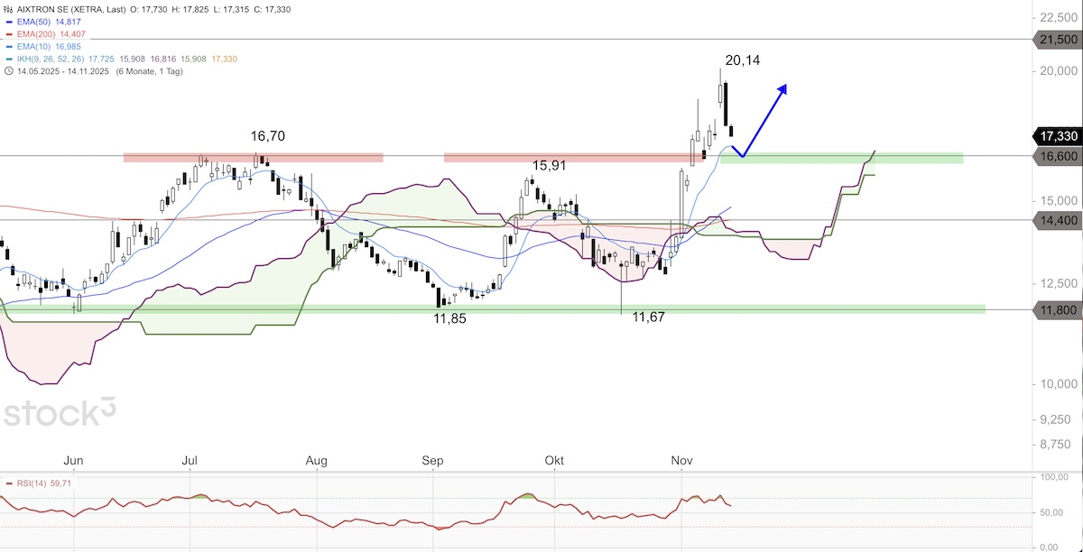 Die Aktien von AIXTRON hatten nach mehreren Abprallern an der Unterstützungszone um 11,80 Euro in den vergangenen Monaten einen deutlichen Aufwärtsimpuls gestartet. Vom Verlaufstief bei 11,67 Euro am 17. Oktober stiegen die Papiere bis auf 20,14 Euro am Mittwoch, drehten anschließend jedoch, im Einklang mit dem Gesamtmarkt, in eine Korrektur. Der übergeordnete Aufwärtstrend bleibt klar intakt, sodass derzeit nur von einem normalen Rücksetzer innerhalb dieses Trends auszugehen ist.