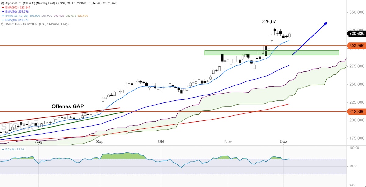 Risikohinweis: Die bereitgestellten Informationen stellen keine Aufforderung zum Kauf oder Verkauf der erwähnten Werte dar. Die besprochenen Wertpapiere sind sehr volatile und risikoreiche Anlageformen. Dies ist keine Anlageberatung, und jede Entscheidung erfolgt auf eigenes Risiko. Hinweis: Stop-Loss-Marken und Gewinnziele dienen lediglich als Orientierung und sollten an das individuelle Risiko- und Geldmanagement sowie die tagesaktuelle Marktentwicklung angepasst werden. Gewinne sollten eigenverantwortlich realisiert werden. Das Erreichen des Kursziels basiert auf dem angegebenen Zielkurs des Basiswerts. Der Autor ist zum Zeitpunkt der Analyse nicht in Alphabet investiert.