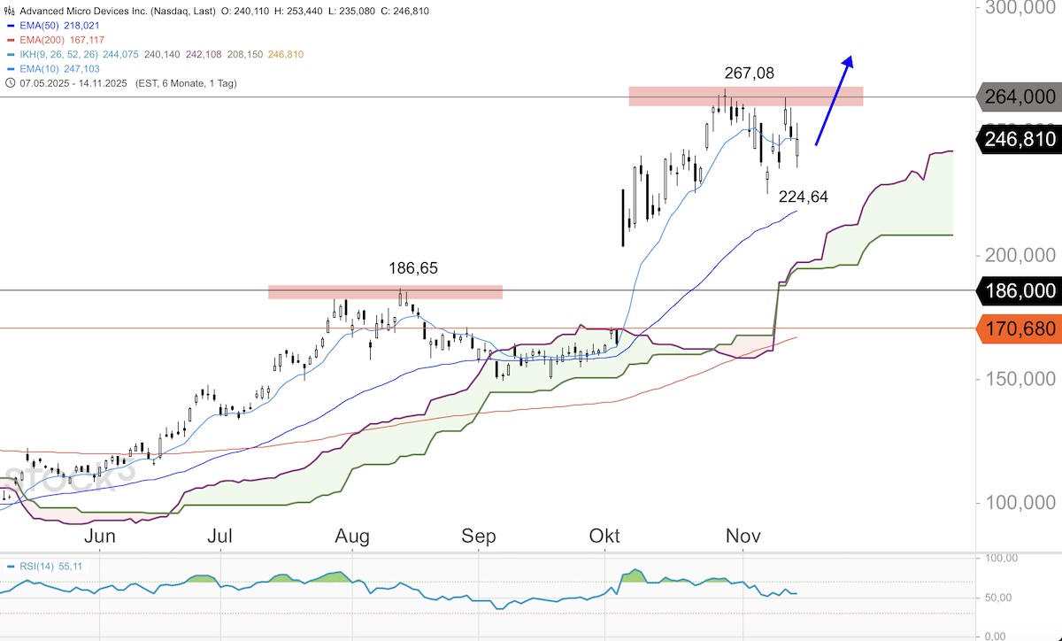 Das Kursziel der vorherigen Short-Position auf die AMD-Aktien vom August um 150 US-Dollar wurde Anfang September Zielgenau mit dem Tief bei 149,22 Dollar vom 08. September erreicht. Am Freitag schlossen die AMD-Aktien mit einer bullischen Tageskerze bei 246,81 Dollar und zeigen sich im Stundenchart in einer Bull-Flag-Formation. Der übergeordnete Aufwärtstrend bleibt klar intakt, und solange das Verlaufstief bei 224,64 Dollar verteidigt wird, bestehen gute Chancen auf einen weiteren Ausbruch nach oben. Unterstützung erhält dieses Szenario nicht nur durch die massive Ichimoku-Wolke auf der Unterseite, sondern auch durch die bullische Saisonalität im Monat November, der neben dem Mai zu den stärksten Monaten des Jahres für die AMD-Aktien zählt. Darüber hinaus ist der Montag historisch betrachtet der stärkste Handelstag für das Papier.