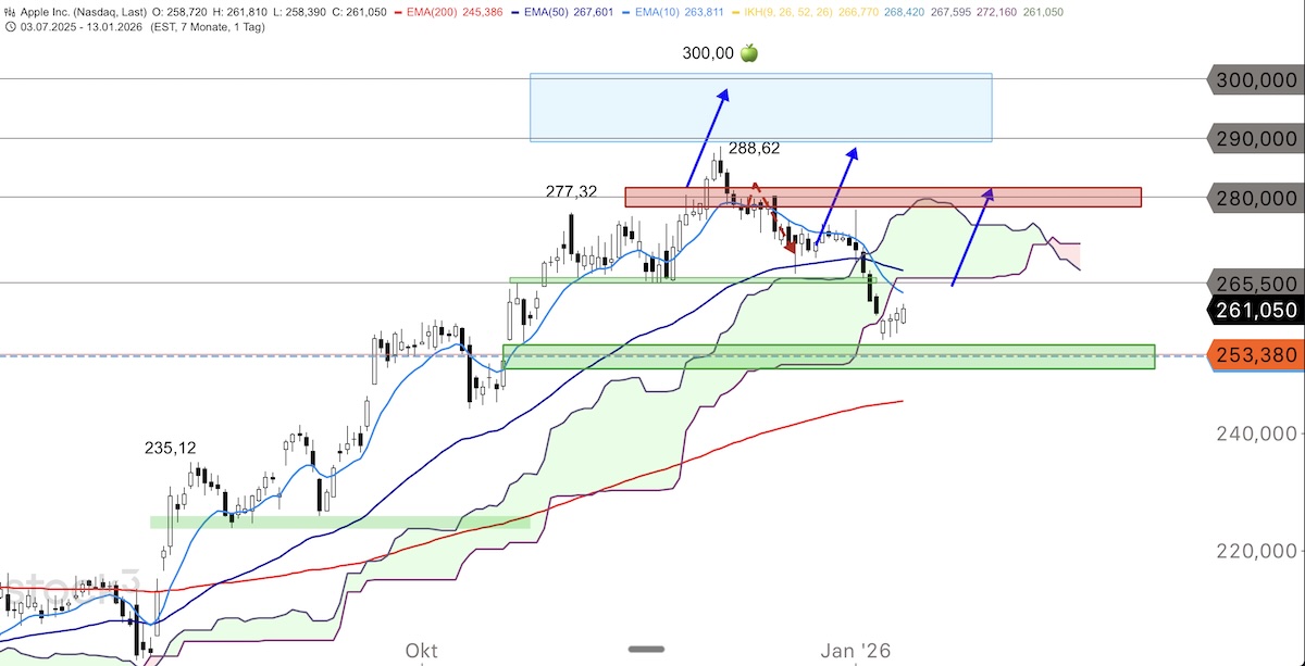 Risikohinweis: Die bereitgestellten Informationen stellen keine Aufforderung zum Kauf oder Verkauf der erwähnten Werte dar. Die besprochenen Wertpapiere sind sehr volatile und risikoreiche Anlageformen. Dies ist keine Anlageberatung, und jede Entscheidung erfolgt auf eigenes Risiko. Hinweis: Stop-Loss-Marken und Gewinnziele dienen lediglich als Orientierung und sollten an das individuelle Risiko- und Geldmanagement sowie die tagesaktuelle Marktentwicklung angepasst werden. Gewinne sollten eigenverantwortlich realisiert werden. Das Erreichen des Kursziels basiert auf dem angegebenen Zielkurs des Basiswerts. Der Autor ist zum Zeitpunkt der Analyse nicht in Apple investiert.