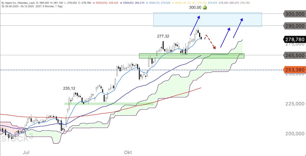Die laufende Korrektur dürfte sich noch etwas fortsetzen. Als Unterstützungszone rückt der Bereich um den 50er-EMA bei aktuell 265,00 Dollar in den Fokus, eine Marke, die in den Vormonaten mehrfach als Sprungbrett für neue Aufwärtsbewegungen diente. Entscheidend bleibt die Ichimoku-Wolke im Tageschart. Solange Apple diese Zone verteidigt, ist der langfristige Aufwärtstrend intakt. Die Fudamentalanalysten bleiben zudem optimistisch. CLSA hat das Kursziel kürzlich deutlich von 265 auf 330 Dollar angehoben. Goldman Sachs sieht das Papier seit kurzem bei 320 Dollar fair bewertet. Nach Abschluss der Korrektur ist ein erneuter Hochlauf in Richtung 290 bis 300 Dollar zu erwarten. Im Anschluss könnte allerdings eine weitere Korrektur folgen. Kurzfristig mahnt das Three Black Crows-Muster zur Vorsicht. Die übergeordnete Aufwärtsstruktur bleibt jedoch intakt, solange die Ichimoku-Wolke hält. Rücksetzer in den Bereich des 50er-EMA bieten Einstiegschancen.