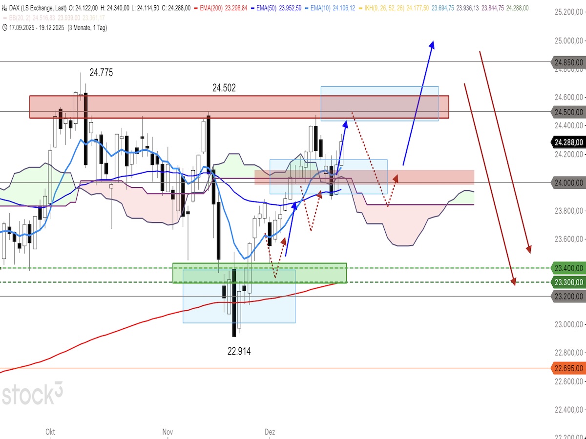 Der DAX konnte am Freitag weiter kräftig zulegen und ging mit einer bullischen Tageskerze bei 24.288 Punkten aus dem Handel. Damit nimmt der Index weiter Kurs auf den Zielbereich von 24.500 bis 24.600 Punkten, den er wahrscheinlich in den kommenden Tagen erreichen wird. Derzeit befinden wir uns mitten im klassischen Zeitfenster der Weihnachtsrallye, das die letzten fünf Handelstage des Jahres sowie die ersten beiden des neuen Jahres umfasst.