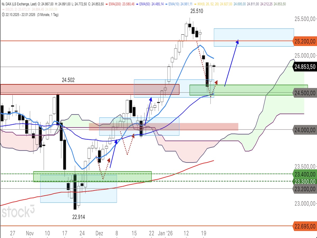 Angeblich kam es mit NATO-Generalsekretär Mark Rutte zu einer Einigung bezüglich Grönland. Man darf gespannt sein, was Dänemark zu dieser Einigung letztendlich sagen wird und ob damit wirklich das letzte Wort in der Grönland-Krise gesprochen wurde. Nachdem sich der DAX am 50er-EMA und der Unterstützungszone um 24.500 Punkte fangen konnte, ist nun mit einem weiteren Hochlauf zunächst zum 10er-EMA bei 24.960 Punkten und darüber zum oberen offenen Gap bei 25.200 Punkten zu rechnen. In der Folge ist aber eher wieder mit einem weiteren Abverkauf zu rechnen.