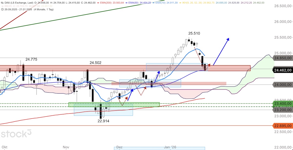 Sollte der DAX wie präferiert am 50er-EMA nach oben abprallen, wäre zunächst ein Hochlauf bis in den Bereich der Zone um 24.900/24.950 Punkte zu erwarten. Hier verläuft aktuell der 10er-EMA, der zunächst als Widerstand fungieren dürfte. Weiter oben befindet sich noch das offene Gap um 25.200 Punkte, welches bei der nächsten längeren Aufwärtsbewegung als Anlaufziel dienen sollte, besonders sobald ein nachhaltiger Durchbruch über den 10er-EMA gelingen würde. Im großen Bild ist die aktuelle Korrektur weiterhin als Korrektur im bestehenden Aufwärtstrend im DAX zu sehen, noch nicht als Trendwechsel von Long auf Short. Allerdings könnte sich die Korrektur auch nach einem Abprall vom 50er-EMA und einem temporären Hochlauf noch weiter fortsetzen. Solange der DAX unter dem 10er-EMA bleibt.