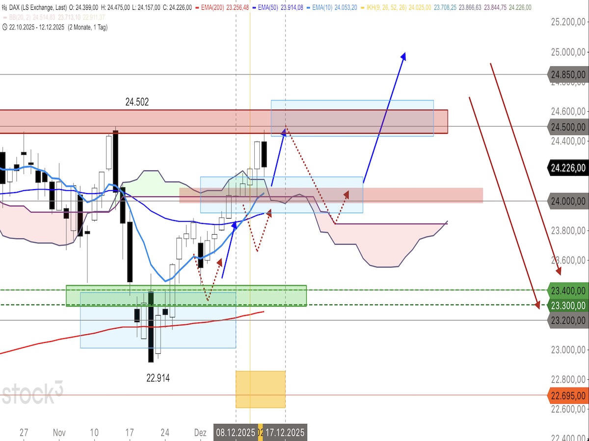 Risikohinweis: Die bereitgestellten Informationen stellen keine Aufforderung zum Kauf oder Verkauf der erwähnten Werte dar. Die besprochenen Wertpapiere sind sehr volatile und risikoreiche Anlageformen. Dies ist keine Anlageberatung, und jede Entscheidung erfolgt auf eigenes Risiko. Hinweis: Stop-Loss-Marken und Gewinnziele dienen lediglich als Orientierung und sollten an das individuelle Risiko- und Geldmanagement sowie die tagesaktuelle Marktentwicklung angepasst werden. Gewinne sollten eigenverantwortlich realisiert werden. Das Erreichen des Kursziels basiert auf dem angegebenen Zielkurs des Basiswerts. Der Autor ist zum Zeitpunkt der Analyse nicht im DAX investiert.