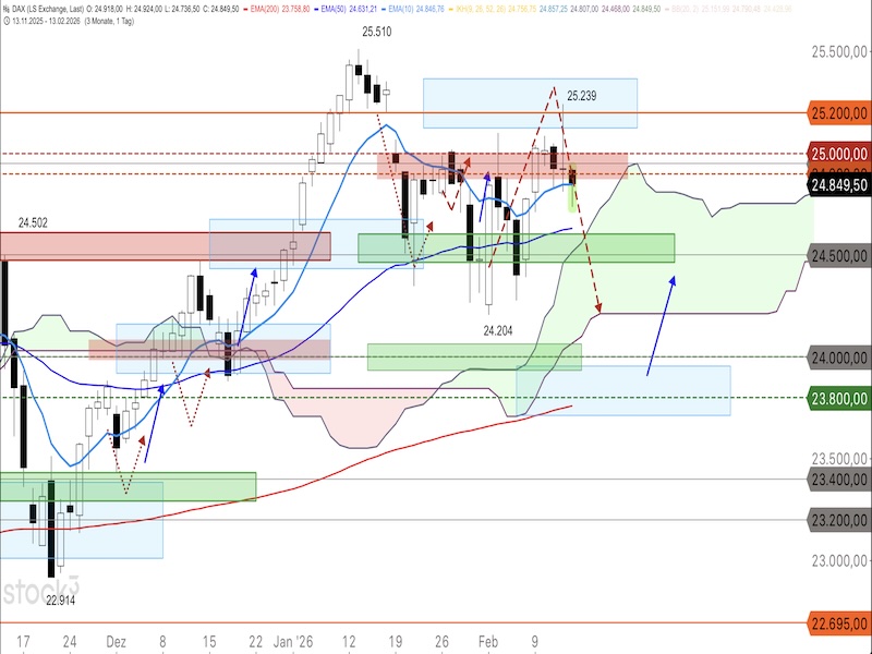 Der DAX schloss am Donnerstag bei 24.849 Punkten und hat damit die Marke von 25.000 Punkten nach unten verlassen. Das Verlaufshoch bei 25.239 Punkten dürfte als tieferes Hoch im Vergleich zum Allzeithoch bei 25.510 Punkten bestätigt sein.