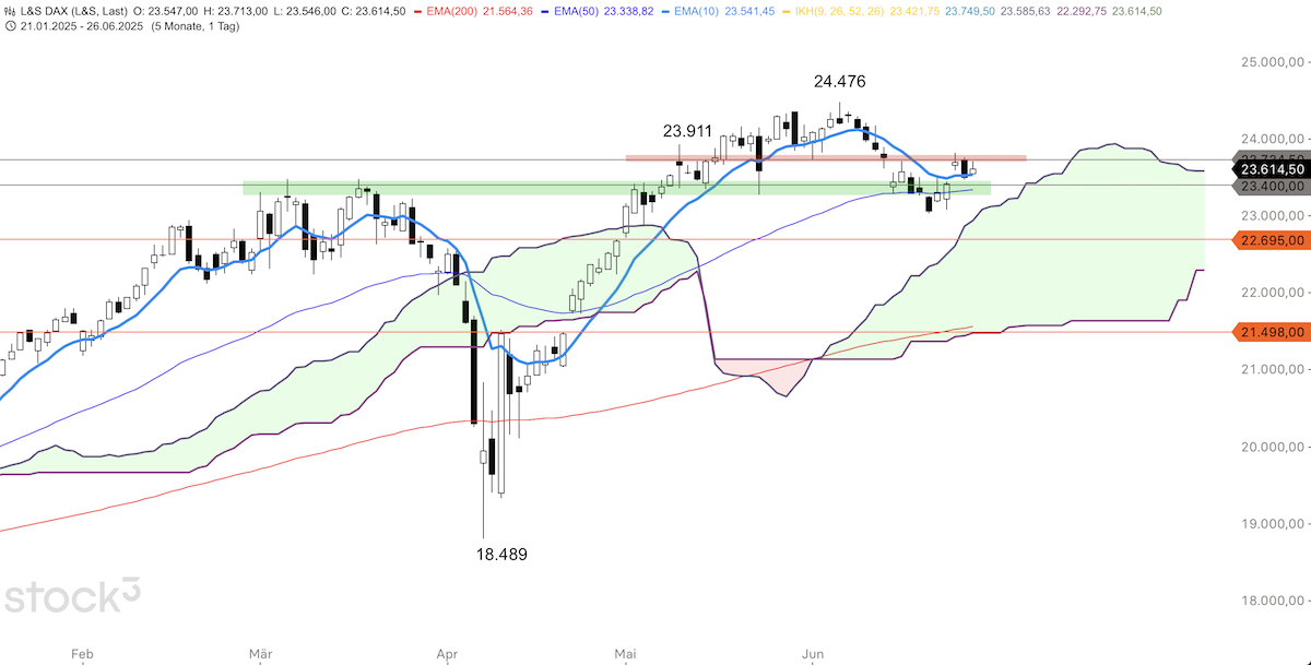 Damit verteidigt der DAX weiterhin den 10er-EMA im Tageschart, der aktuell bei 23.540 Punkten verläuft. Auf der Unterseite stützt zudem eine starke technische Unterstützungszone, bestehend aus der Ichimoku-Wolke, dem 10er-EMA, der horizontalen Marke bei 23.400 Punkten sowie dem 50er-EMA bei 23.340 Punkten. Nach dem Rücklauf könnte der DAX nun vor einem erneuten Anlauf auf den Widerstand bei 23.750/23.800 Punkten stehen. Ein Ausbruch über diese Zone würde ein neues Stärkesignal liefern. Mit Potenzial für einen Hochlauf bis 24.000 Punkte. Bereits in der vorherigen Analyse hieß es: „Solange der DAX über der Ichimoku-Wolke im 2-Stundenchart bleibt, ist mittelfristig mit weiter steigenden Kursen zu rechnen.“ Diese Einschätzung hat sich bislang bewährt und bleibt aktuell gültig. Saisonal könnte der DAX zusätzlich ab Anfang Juli Rückenwind erhalten. Allerdings muss der Zollstreit zwischen den USA und der EU beachtet werden. Die Frist für eine Einigung läuft am 09. Juli ab. Geopolitisch sorgt die Aussicht auf eine Waffenruhe zwischen Iran und Israel sowie der fallende Ölpreis für kurzfristige Erleichterung, doch die Märkte bleiben auch hier anfällig. Neue Spannungen könnten jederzeit wieder für Verunsicherung sorgen.