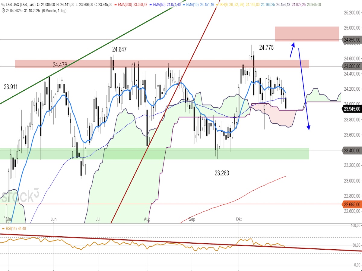 Unterstützung könnte er dabei von der saisonal bullischen Tendenz im November erhalten, da sowohl zu Monatsbeginn als auch im Verlauf des Monats häufig steigende Kurse zu beobachten sind. Entscheidend wäre nun, dass die Erholung anhält und der DAX nicht erneut unter die Ichimoku-Wolke im Tageschart fällt. Ein Anstieg über den 50er-EMA bei 24.074 Punkten und den 10er-EMA bei 24.151 Punkten würde neue Stärkesignale liefern. Solange die Ichimoku-Wolke im Tageschart verteidigt wird, überwiegen die Chancen auf eine Fortsetzung der Aufwärtsbewegung in Richtung 24.500 Punkte.
