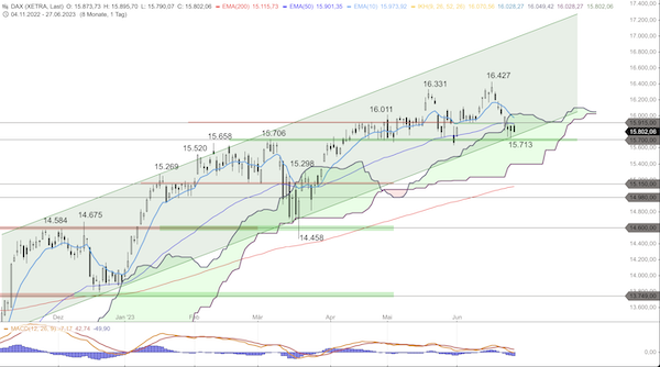 Der DAX ist am heutigen Dienstag zunächst weiter angestiegen und konnte die Aufwärtsdynamik vom Vortag weiter fortsetzen. Im Tageshoch erreichte der DAX 15.895 Punkte und sackte in der Folge wieder ab. Aktuell zeigt sich der DAX erneut im Bereich von 15.800 Punkten tiefer.
