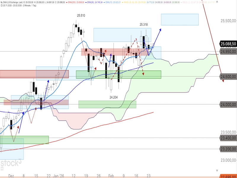 Risikohinweis: Die bereitgestellten Informationen stellen keine Aufforderung zum Kauf oder Verkauf der erwähnten Werte dar. Die besprochenen Wertpapiere sind sehr volatile und risikoreiche Anlageformen. Dies ist keine Anlageberatung, und jede Entscheidung erfolgt auf eigenes Risiko. Hinweis: Stop-Loss-Marken und Gewinnziele dienen lediglich als Orientierung und sollten an das individuelle Risiko- und Geldmanagement sowie die tagesaktuelle Marktentwicklung angepasst werden. Gewinne sollten eigenverantwortlich realisiert werden. Das Erreichen des Kursziels basiert auf dem angegebenen Zielkurs des Basiswerts. Der Autor ist zum Zeitpunkt der Analyse nicht im DAX investiert.
