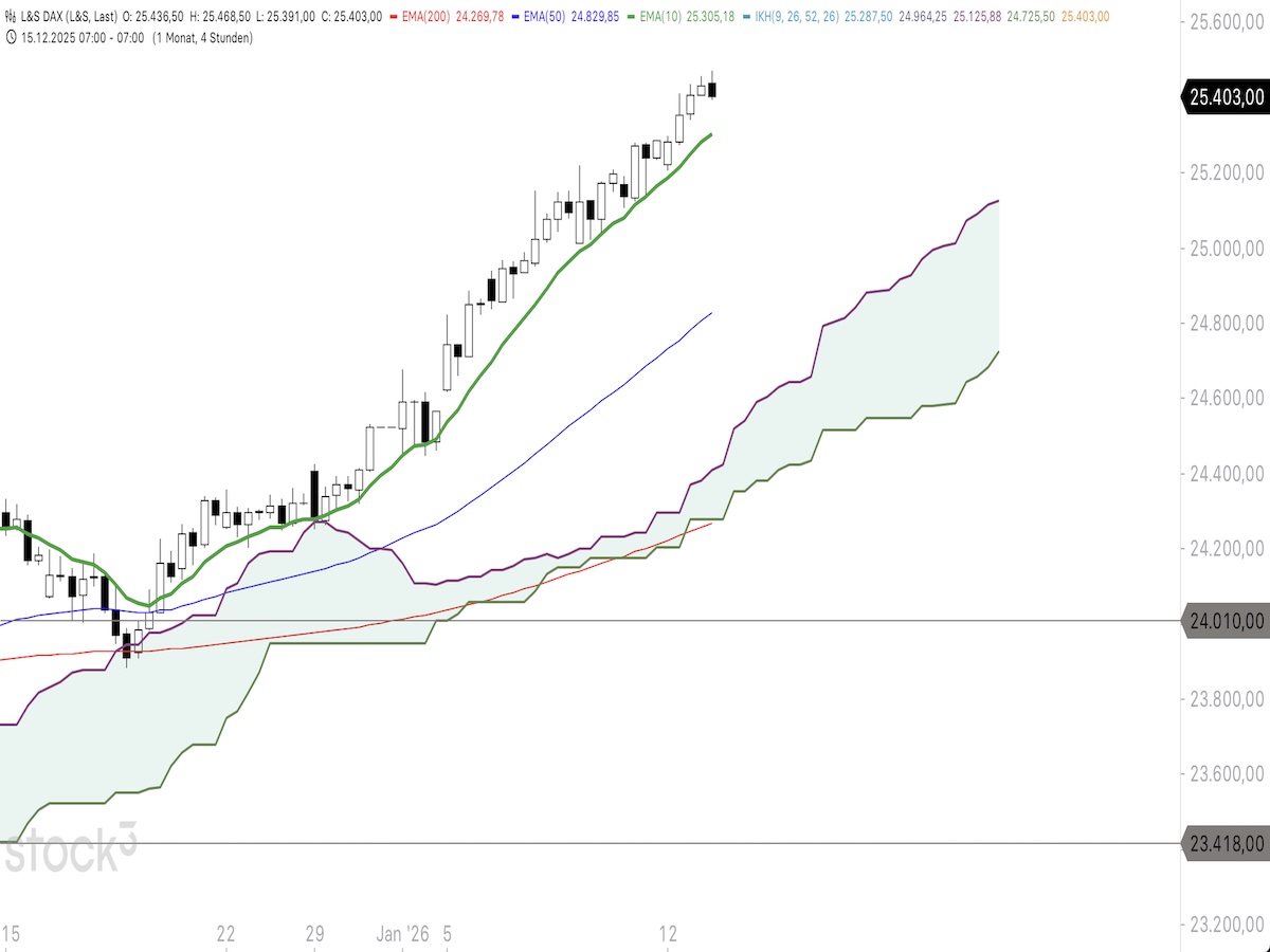Es bieten sich weiter Long-Positionen auf den DAX an, solange der 10er-EMA im 4h-Chart nicht nach unten durchbrochen wird. Dazu könnte ein Turbo-Long von L&S (LX5V6X) um 25.300 Punkte erwogen werden. Das Kursziel für diese Long-Strategie liegt erneut um 25.500 Punkte (wobei das Produkt bei einem Preis von etwa €27,95 notieren würde). Der Stopp-Loss könnte zunächst bei 25.200 Punkten gesetzt werden (entsprechend ca. €24,95 für das Produkt), wobei dieser Stopp zügig nachgezogen werden sollte, sobald die Position in den Gewinn läuft.