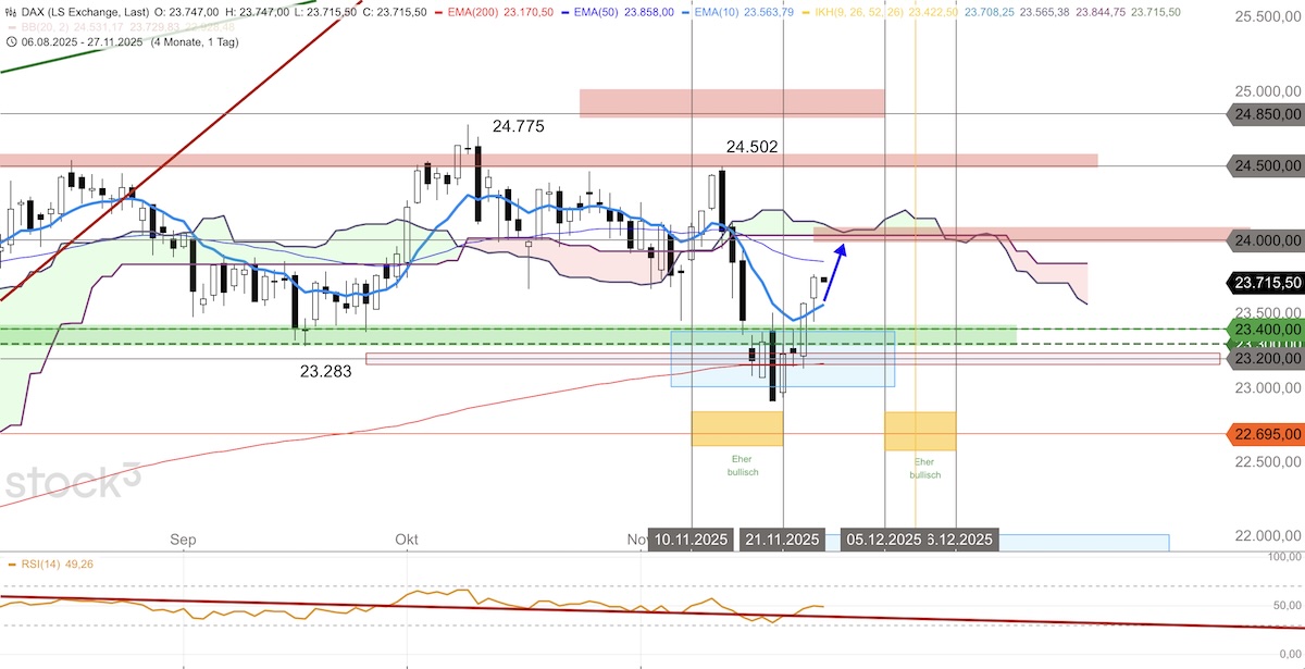 Setzt der DAX seinen Anstieg hingegen direkt fort, liegt das nächste Ziel am 50er-EMA bei rund 23.863 Punkten. Insgesamt dürfte der Index, unter kleineren Zwischenkorrekturen, seinen Aufwärtstrend fortsetzen und mittelfristig Kurs auf die Marke von 24.000 Punkten nehmen. Der Bereich um 24.000 Punkte ist das nächste große Anlaufziel. Gelingt dem DAX ein Anstieg darüber hinaus, wäre mit einem weiteren Hochlauf bis zum Widerstand um 24.500 Punkte zu rechnen. Allerdings könnte der DAX um 24.000 Punkte auch wieder nachhaltig nach unten abdrehen und vor einer längeren Korrektur stehen. Die Marke um 24.000 Punkte könnte also zu einer mittelfristigen Weichenstellung für den DAX werden.
