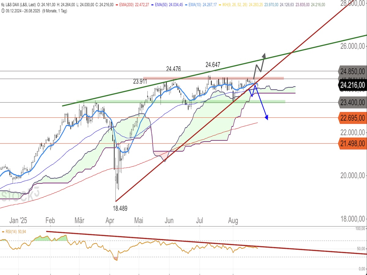 Risikohinweis: Die bereitgestellten Informationen stellen keine Aufforderung zum Kauf oder Verkauf der erwähnten Werte dar. Die besprochenen Wertpapiere sind sehr volatile und risikoreiche Anlageformen. Dies ist keine Anlageberatung, und jede Entscheidung erfolgt auf eigenes Risiko. Hinweis: Stop-Loss-Marken und Gewinnziele dienen lediglich als Orientierung und sollten an das individuelle Risiko- und Geldmanagement sowie die tagesaktuelle Marktentwicklung angepasst werden. Gewinne sollten eigenverantwortlich realisiert werden. Das Erreichen des Kursziels basiert auf dem angegebenen Zielkurs des Basiswerts. Der Autor ist zum Zeitpunkt der Analyse nicht im DAX investiert.